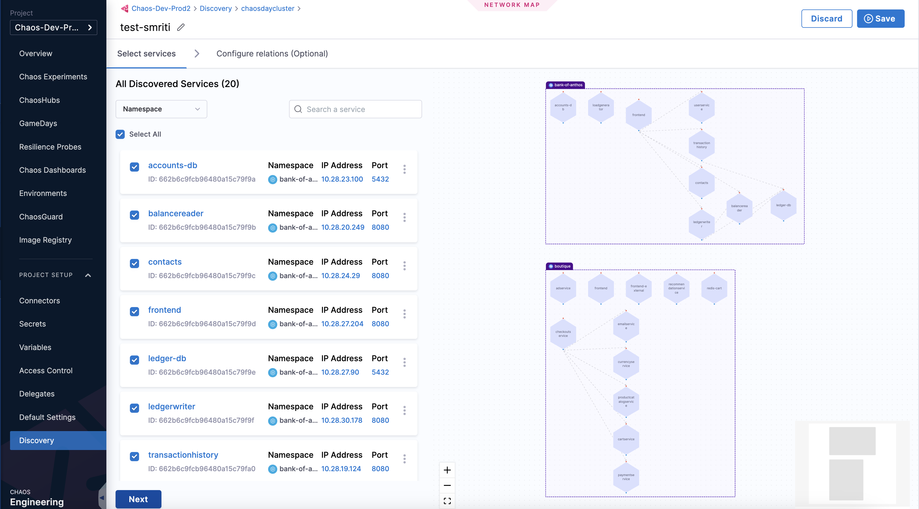 In the step where you select one or more discovered services, choose a specific service on which you want to inject chaos, and click Next.
