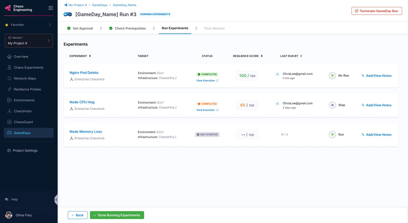 • Select Done Running Experiments to complete the run. If your chaos experiments have faults that have not run, they will be marked Skipped.