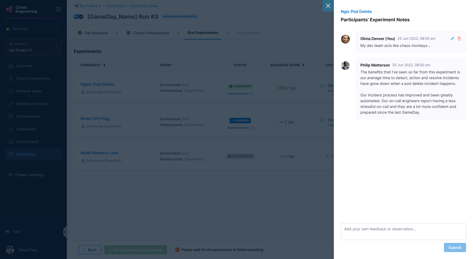 • Select Add/View Notes to note your findings about experiments in the GameDay.