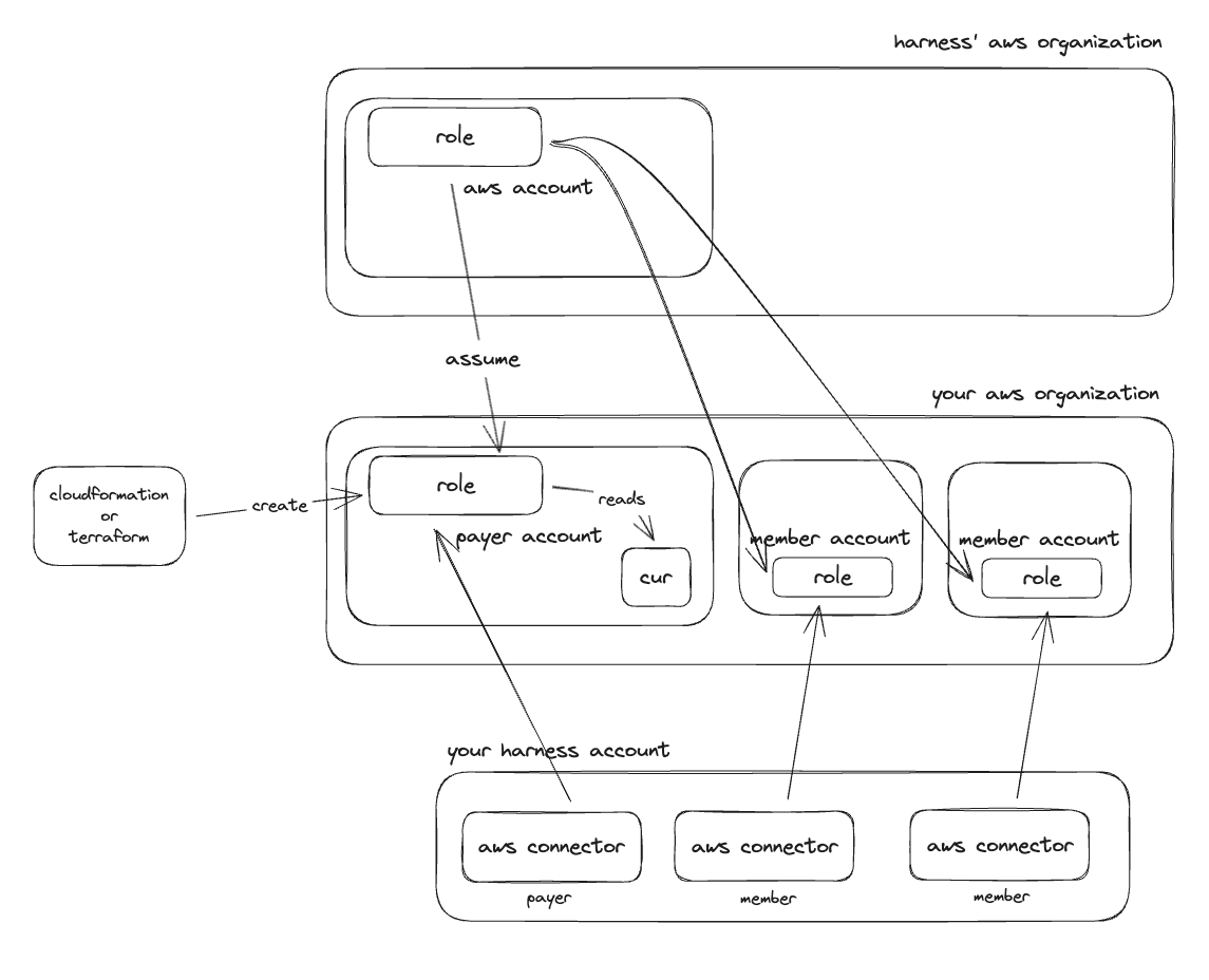 The first step is to create a CUR (Cost Usage Report) in the payer account. Once the CUR is created, we will need to create a role that has access to the S3 bucket that the CUR resides in. This role will have a trust policy that allows Harness to assume the role and copy the CUR data to an S3 bucket in Harness' AWS account for data ingestion.