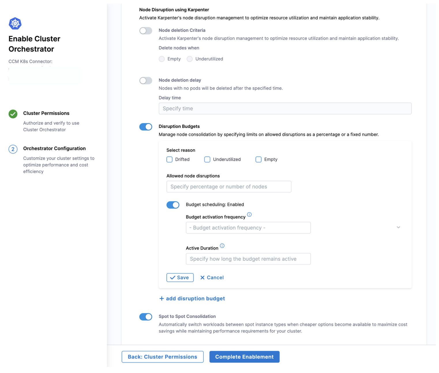Node Disruption Using Karpenter: Activate Karpenter's node disruption management to optimize resource utilization and maintain application stability. Toggalable Options: