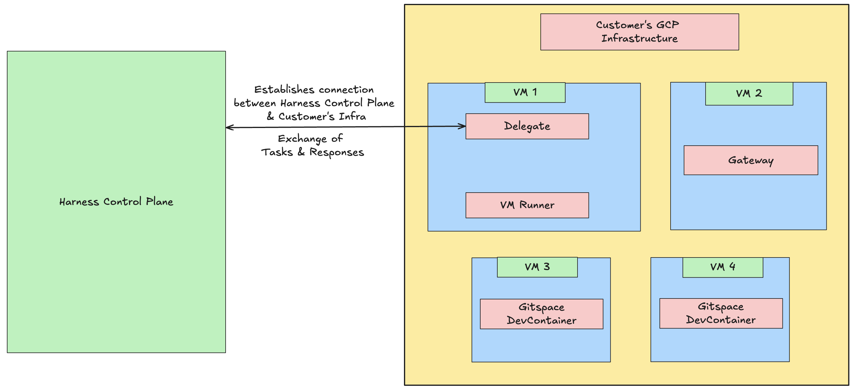 The VM Runner is responsible for managing the VM lifecycle. The VM Runner creates a VM on demand for executing the tasks. When the Delegate receives any Task Request from the Harness Control Plane, it forwards the request to the Runner, which executes the task on the created VM and manages the VM lifecycle according to the request. Read more about VM Runner.