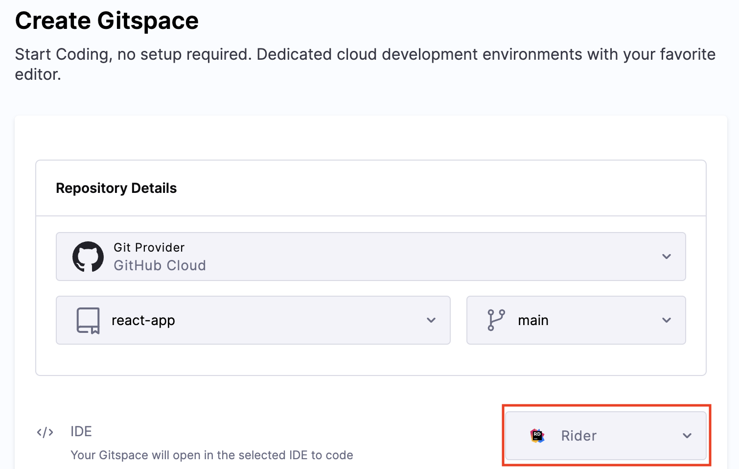 Follow these steps to get started with integrating Rider IDE into your Gitspaces workflow:
