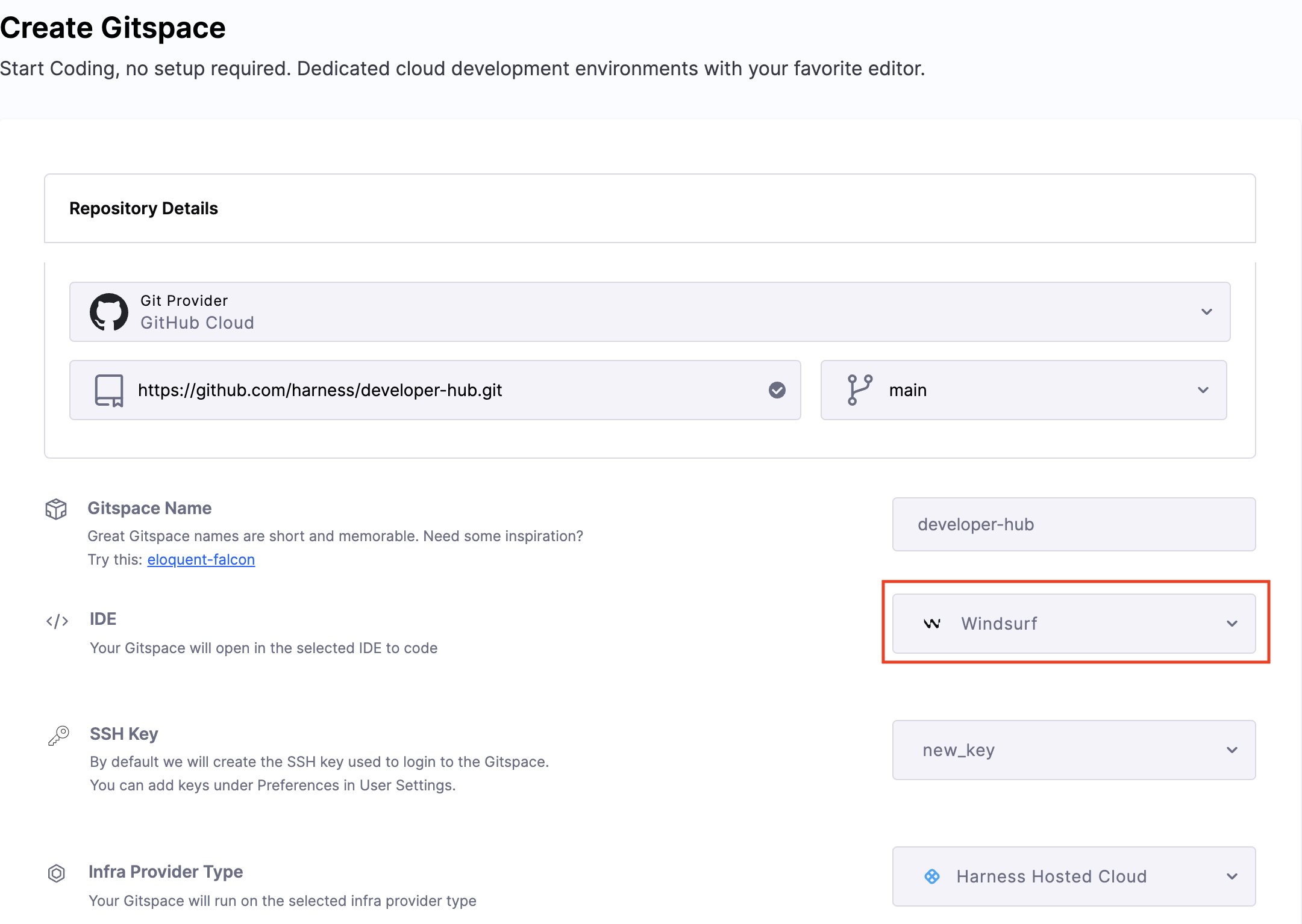 With Windsurf support, Harness CDE enables seamless and efficient remote development in your Gitspaces within your Windsurf IDE. This enables you to use Windsurf and agentic AI features to enhance your remote development experience.