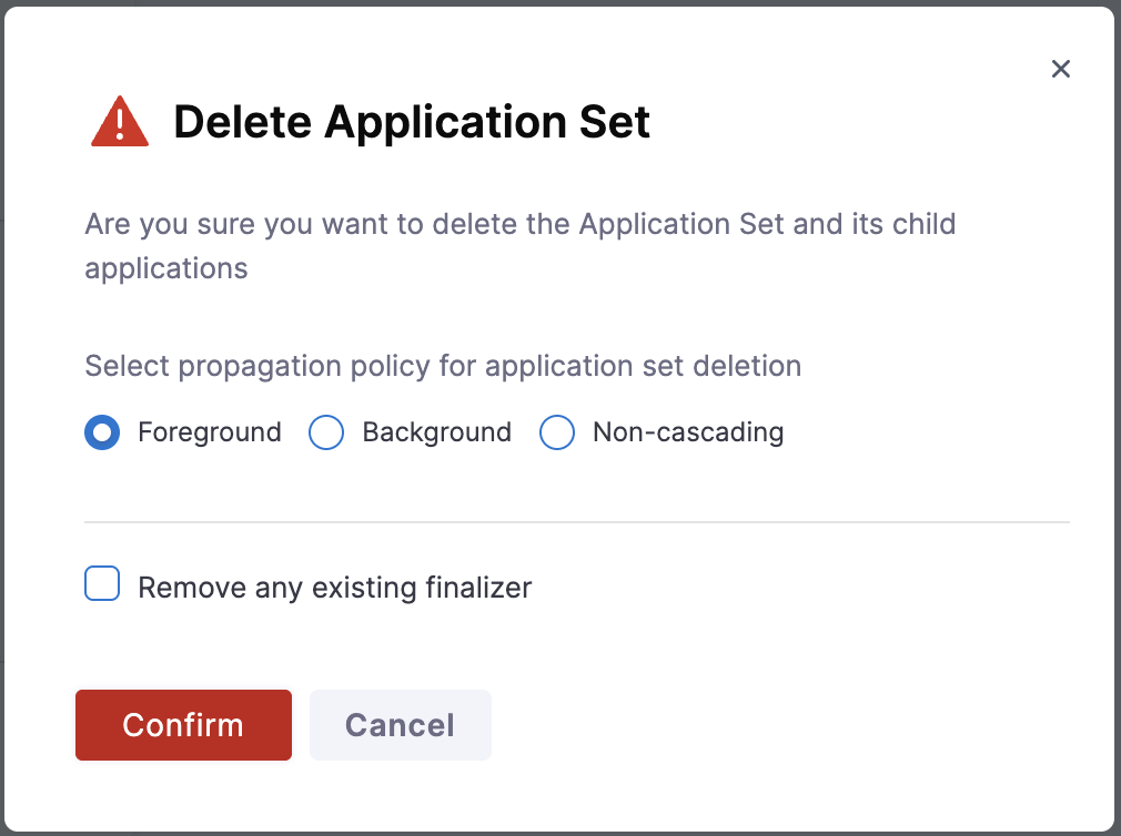 Remove any existing finalizer: Check this option to remove Kubernetes finalizers and force immediate deletion. Only use this if the ApplicationSet is stuck in a deleting state.