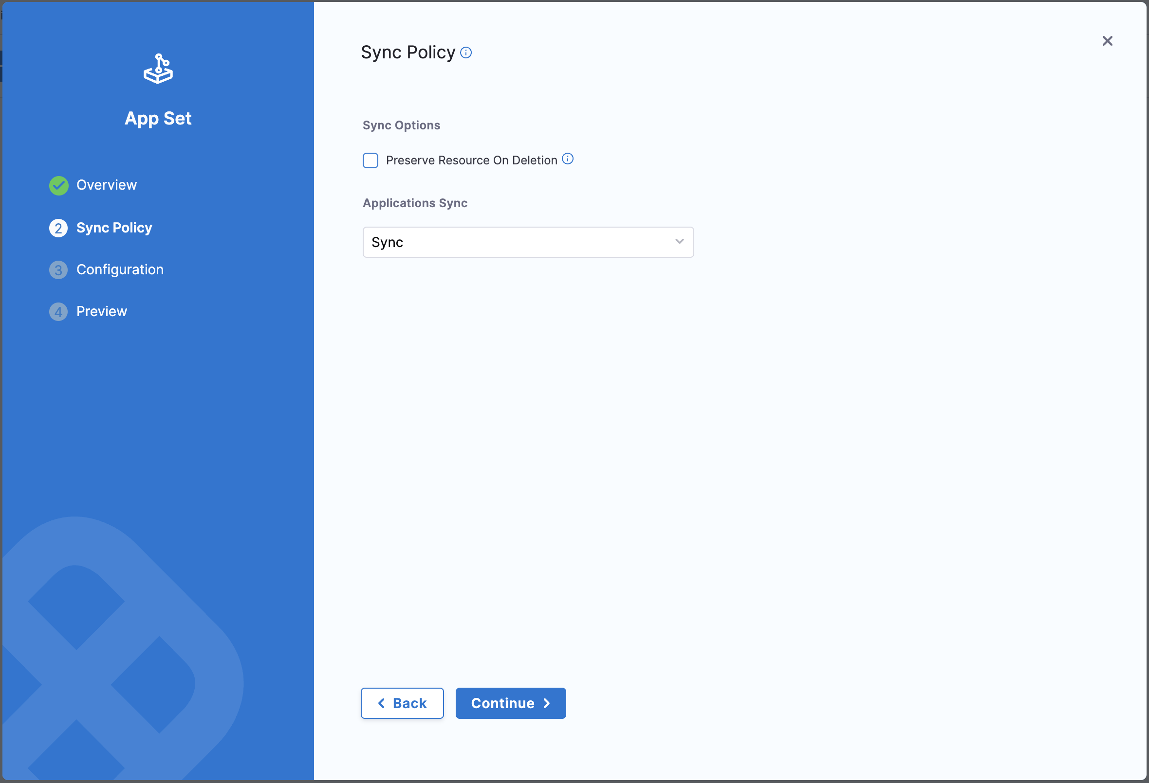 On the Sync Policy tab, define the sync policy that governs the relationship between the ApplicationSet and its child applications.