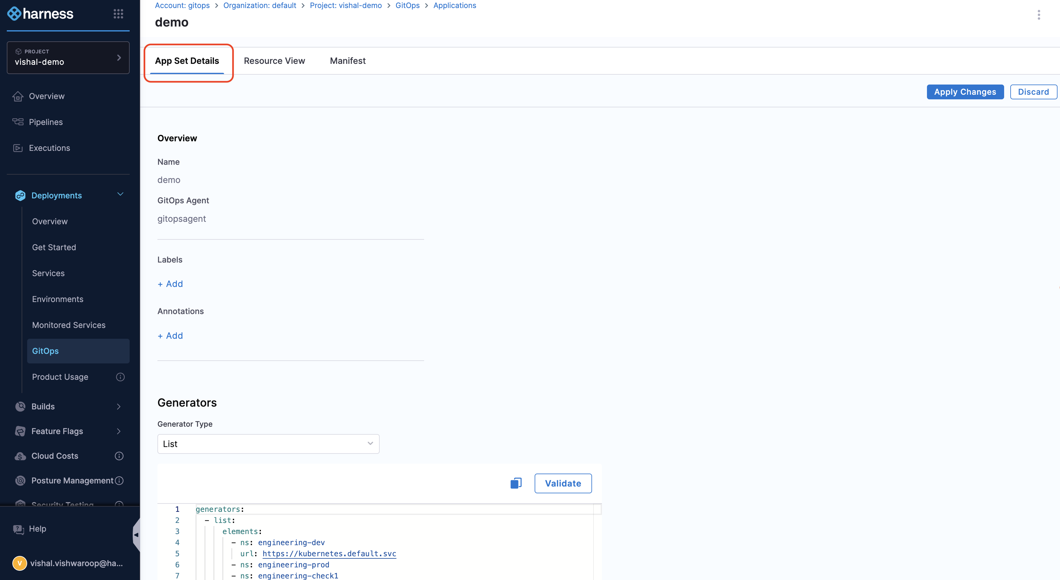 From the Applications view, you can sync the Harness ApplicationSet application or the individual child applications independently.