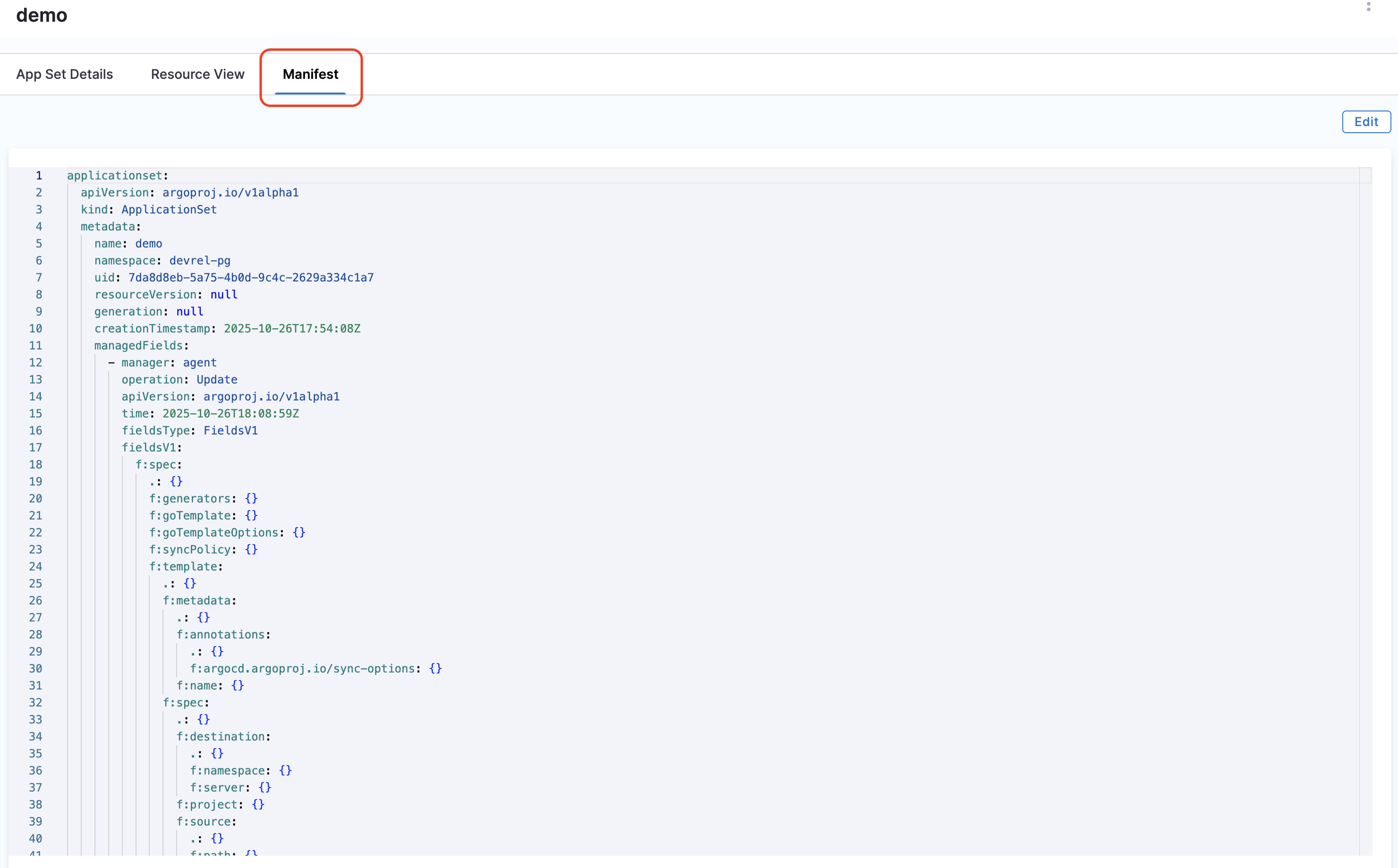 - Click on the Manifest tab to see the complete manifest generated for the ApplicationSet.