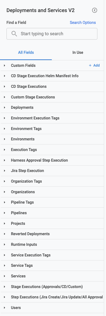 When you select CD-specific fields (for example, from CD Stage Execution Helm Manifest Info, CD Stage Executions, Environments, or Services views), the data displayed will only include CD stage–related executions.