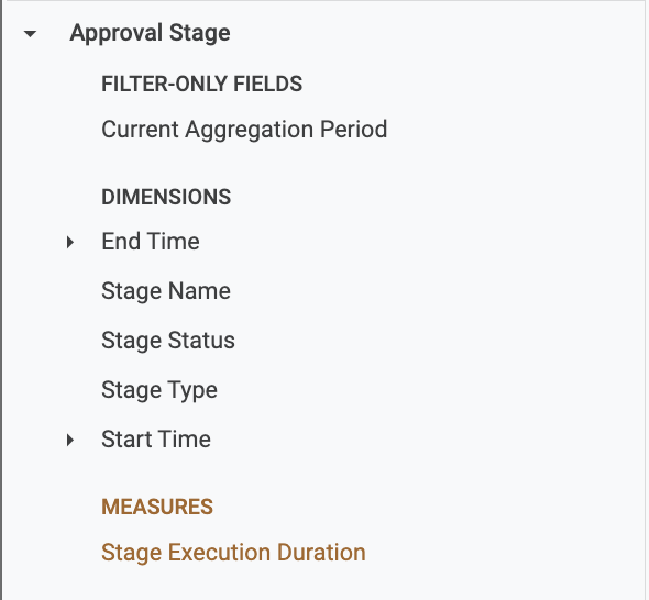 Similarly, when you select fields from the Custom Stage Executions view, only custom stage data is displayed.