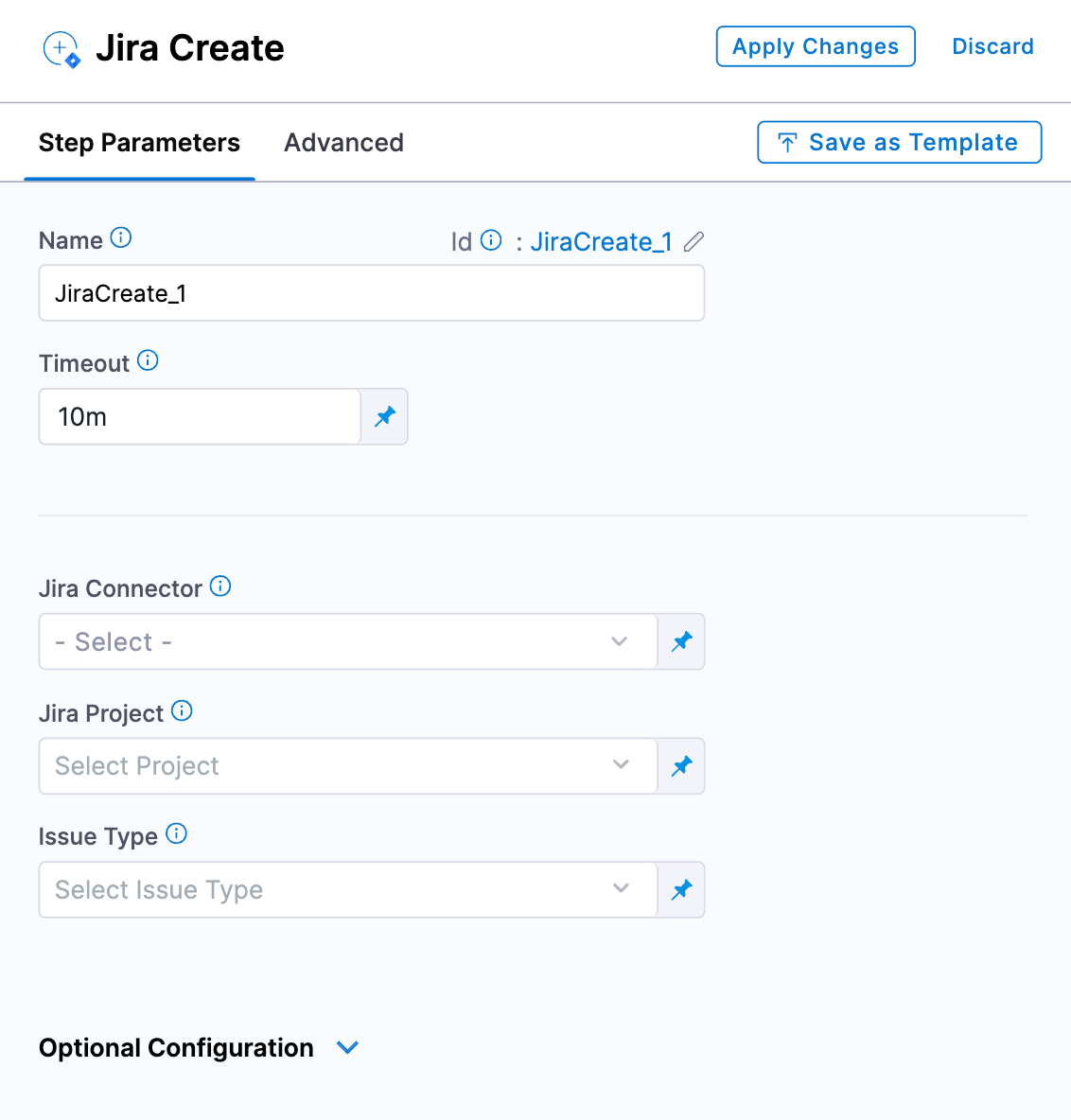 In Timeout, enter how long you want Harness to try to create the issue before failing (and initiating the stage or step failure strategy).