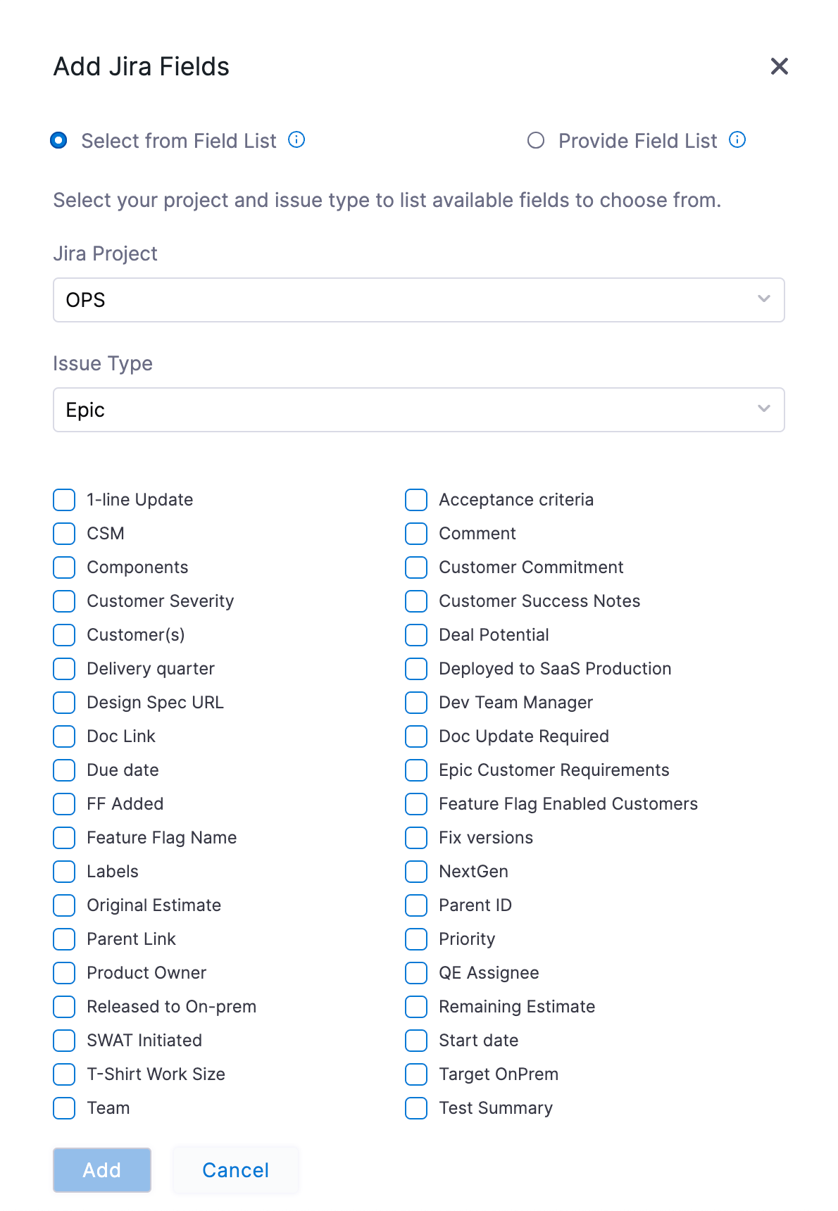 In Jira fields, you can select specific fields within a Jira issue. For more information on custom fields, go to Jira custom fields.