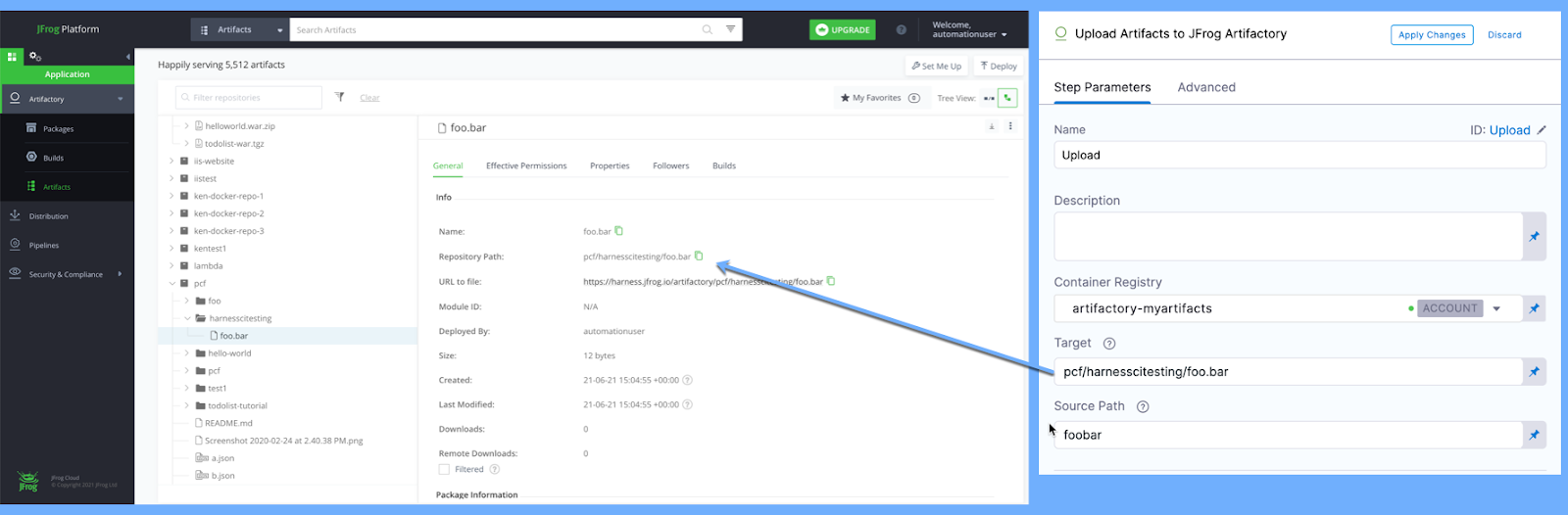 Use the Upload Artifacts to JFrog Artifactory step in your CI pipelines to upload artifacts to JFrog Artifactory non-Docker registries. To learn how to push Docker images to JFrog Docker registry, see Build and Push to JFrog Docker registries.