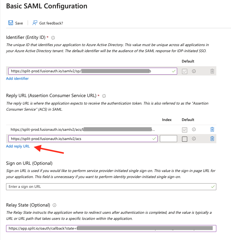 5. Click on Add reply URL and set the Reply URL to the Requestable SSO URL provided in Split in the configuration parameters: