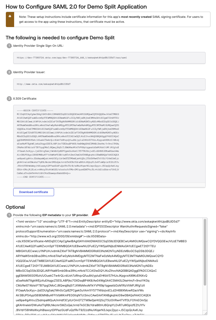 2. Add the IdP metadata copied from Okta.