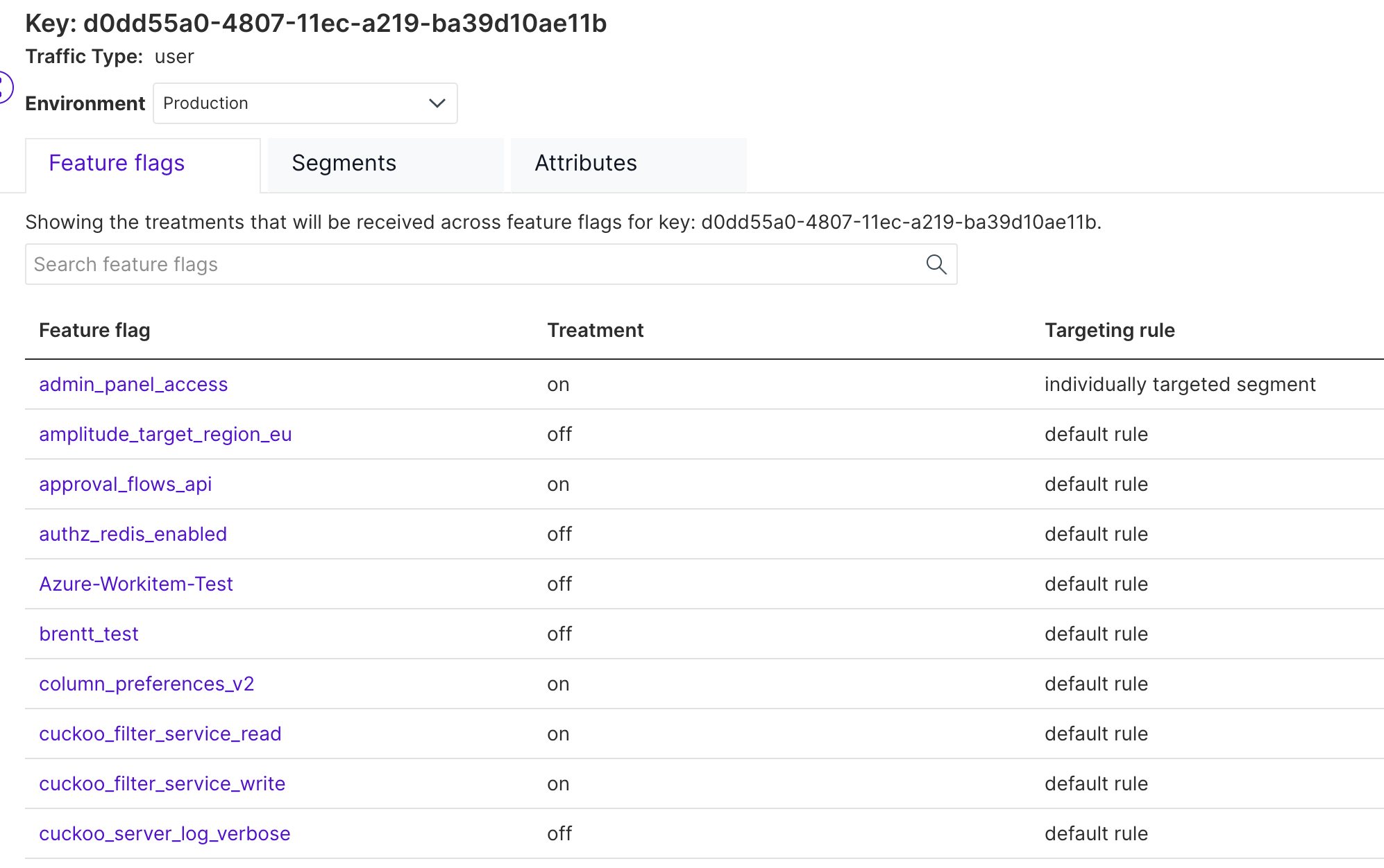 - This view only shows treatments for feature flags not using attributes for targeting.