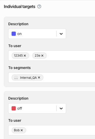 Targeting defines how your feature flag will be evaluated for a given user ID (user key). You can add individual user IDs to your targeting rules.
