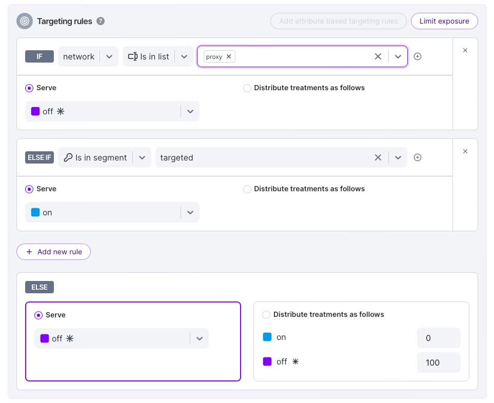 • Optionally click the Limit exposure button to limit the traffic exposed to your attribute based targeting rules. For example, you can limit the customers exposed to your experiment to the percentage you choose. Users who are not exposed get the default treatment.