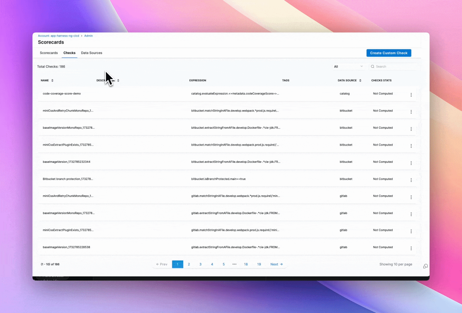 Now select Create Custom Check and add a New Custom Check to check the code coverage score, select the data source as Catalog Info YAML and data point as Evaluate Expression(JEXL).