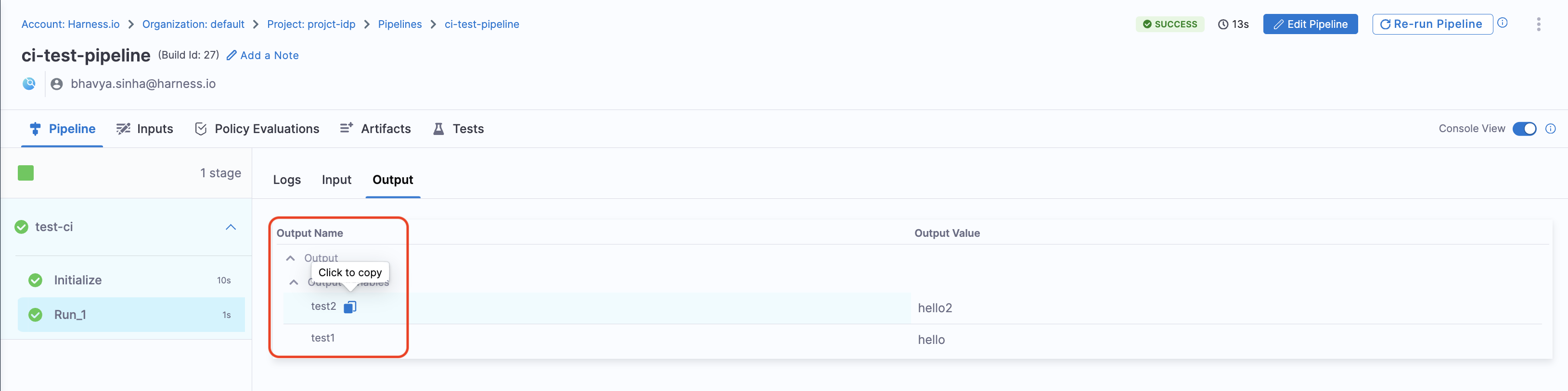 ${{ steps.trigger.output['pipeline.stages.testci.spec.execution.steps.Run_1.output.outputVariables.test1'] }}, here the partpipeline.stages.testci.spec.execution.steps.Run_1.output.outputVariables.test1comes from<+pipeline.stages.testci.spec.execution.steps.Run_1.output.outputVariables.test2>copied from execution logs.