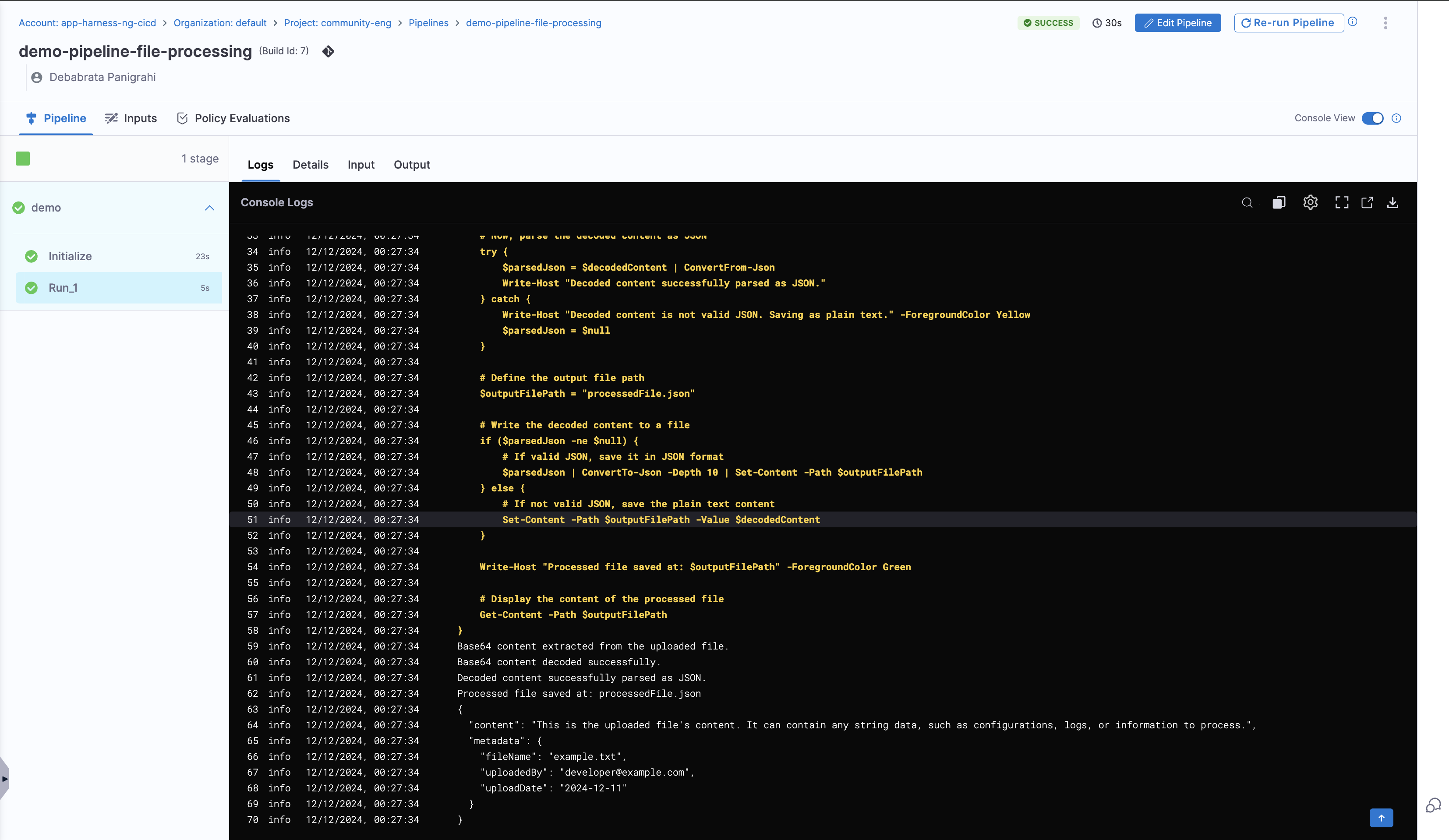 Here's an example harness pipeline that uses PowerShell in run step to decode the content of the file uploaded to Workflows.