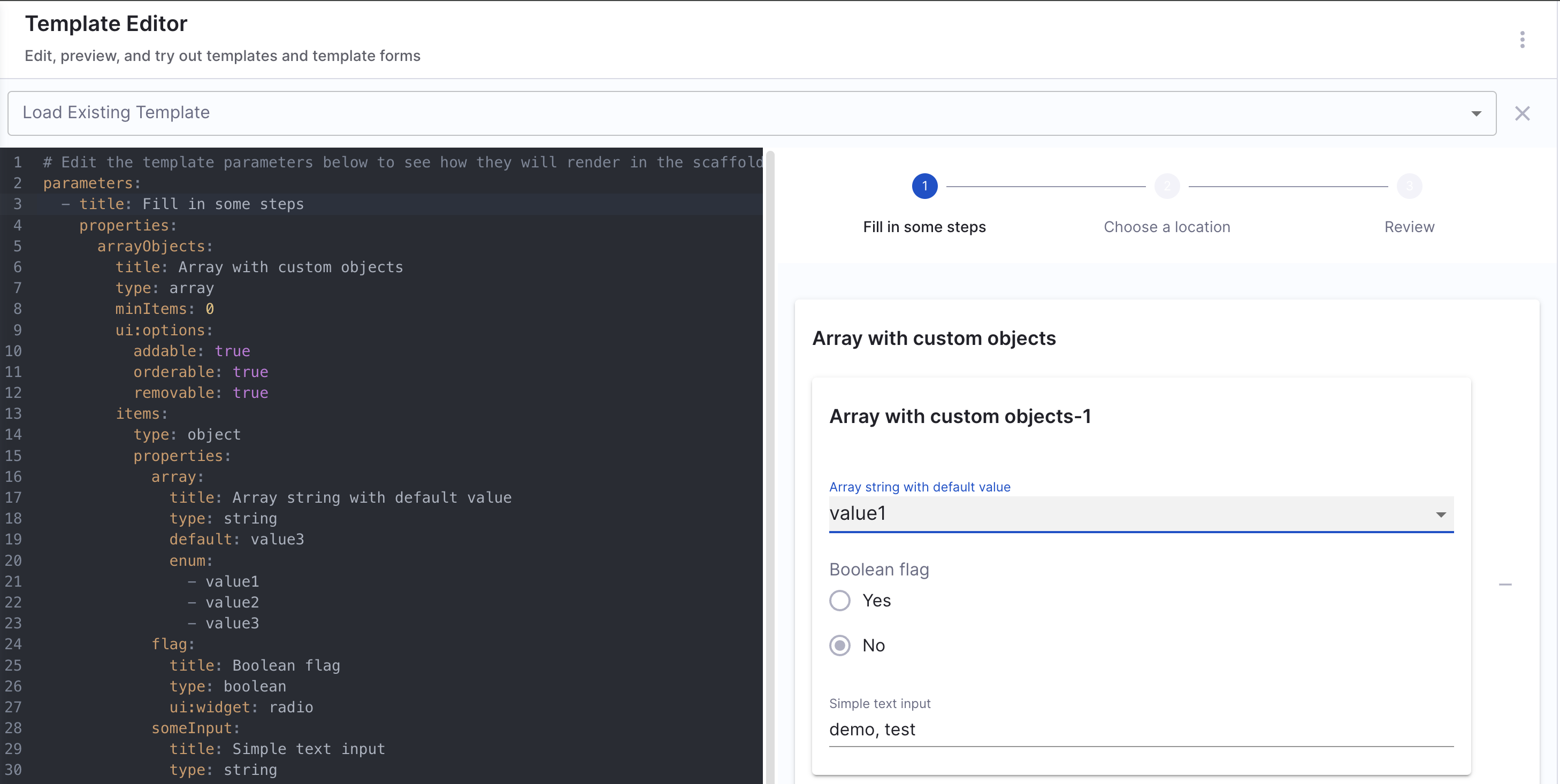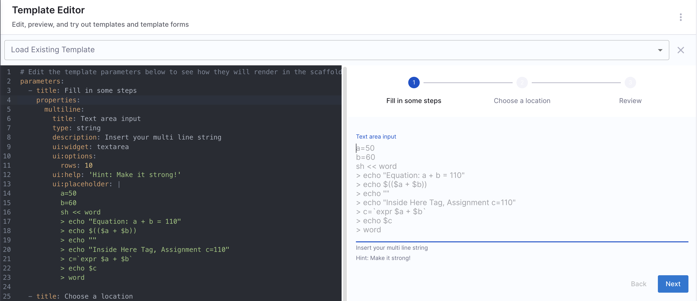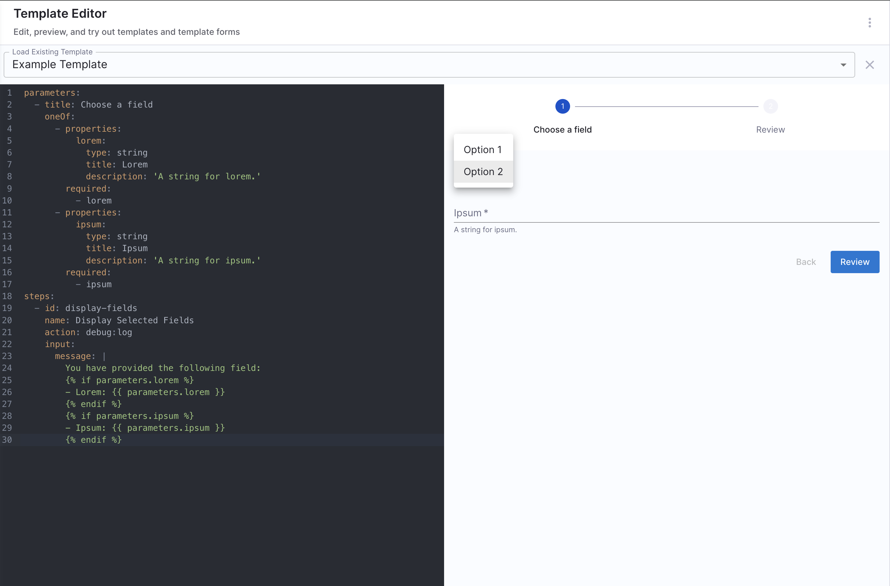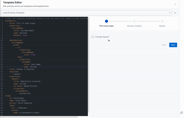 For scenarios not covered in this guide, it is recommended to use the react-jsonschema-form playground to design the UI for input fields. Additionally, Nunjucks serves as the templating engine for Self-Service Workflows.
