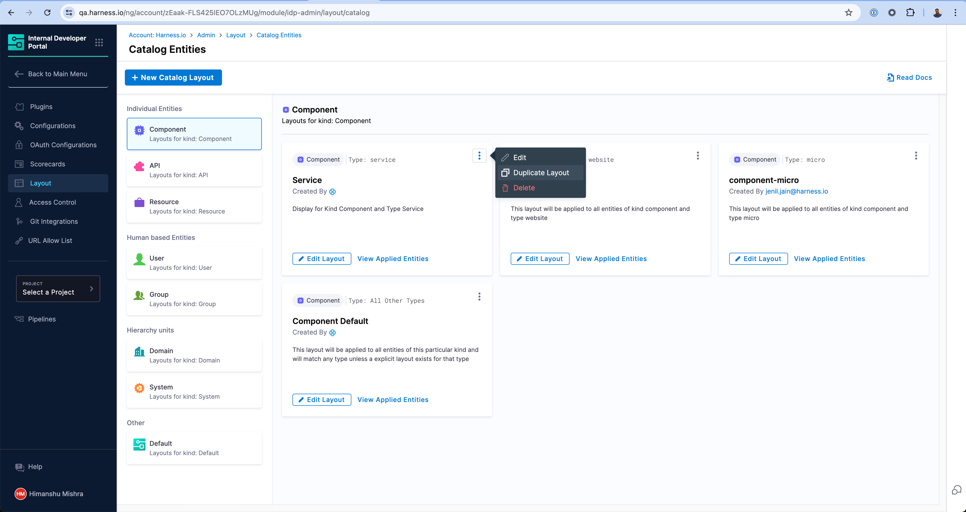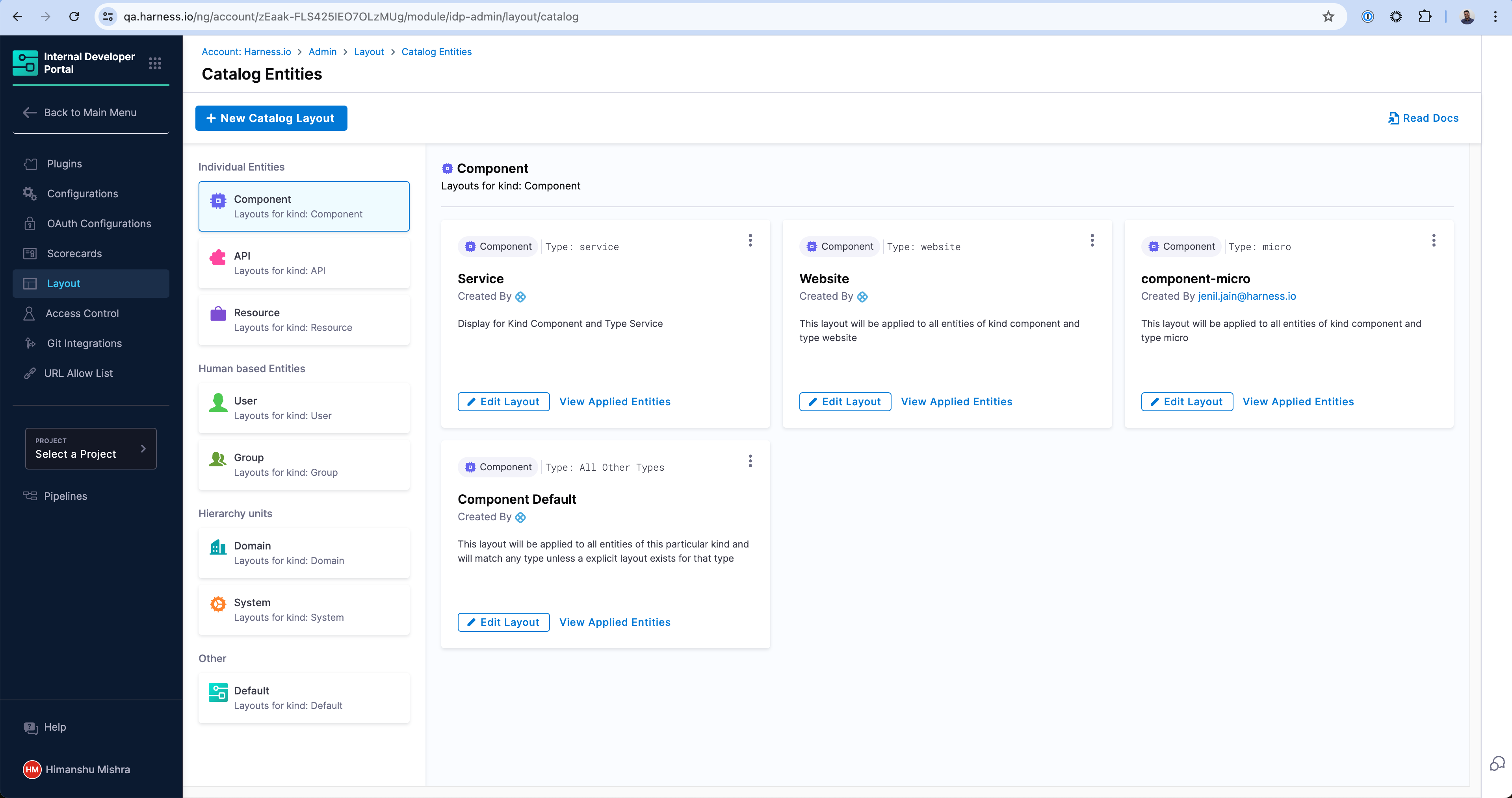 2. Select the entity whose layout you want to edit, or create a new catalog layout.
