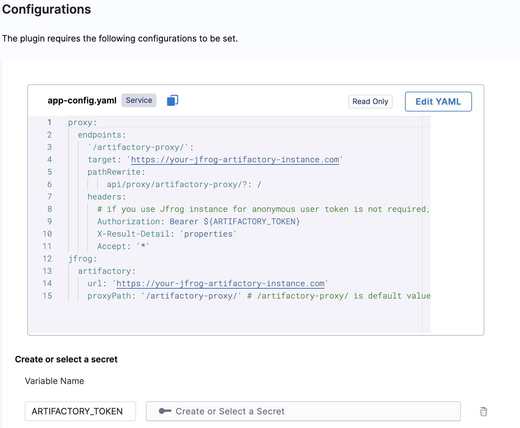 This plugin requires a backend proxy configuration to make calls to JFrog with authentication.