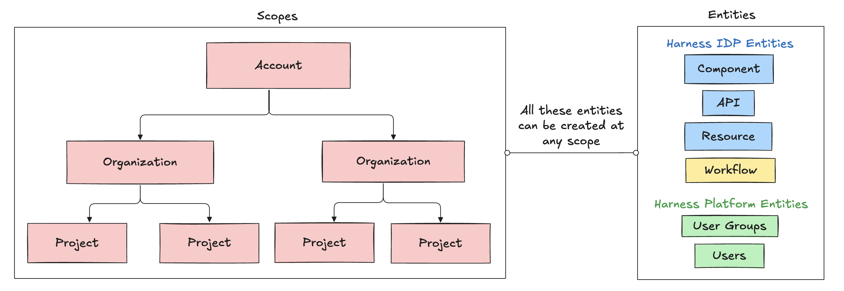 To learn more about the entities, permissions, and different scopes we've introduced with IDP 2.0, please refer to the Data Model here. To learn more about configuring Harness RBAC, visit Configure RBAC in Harness.