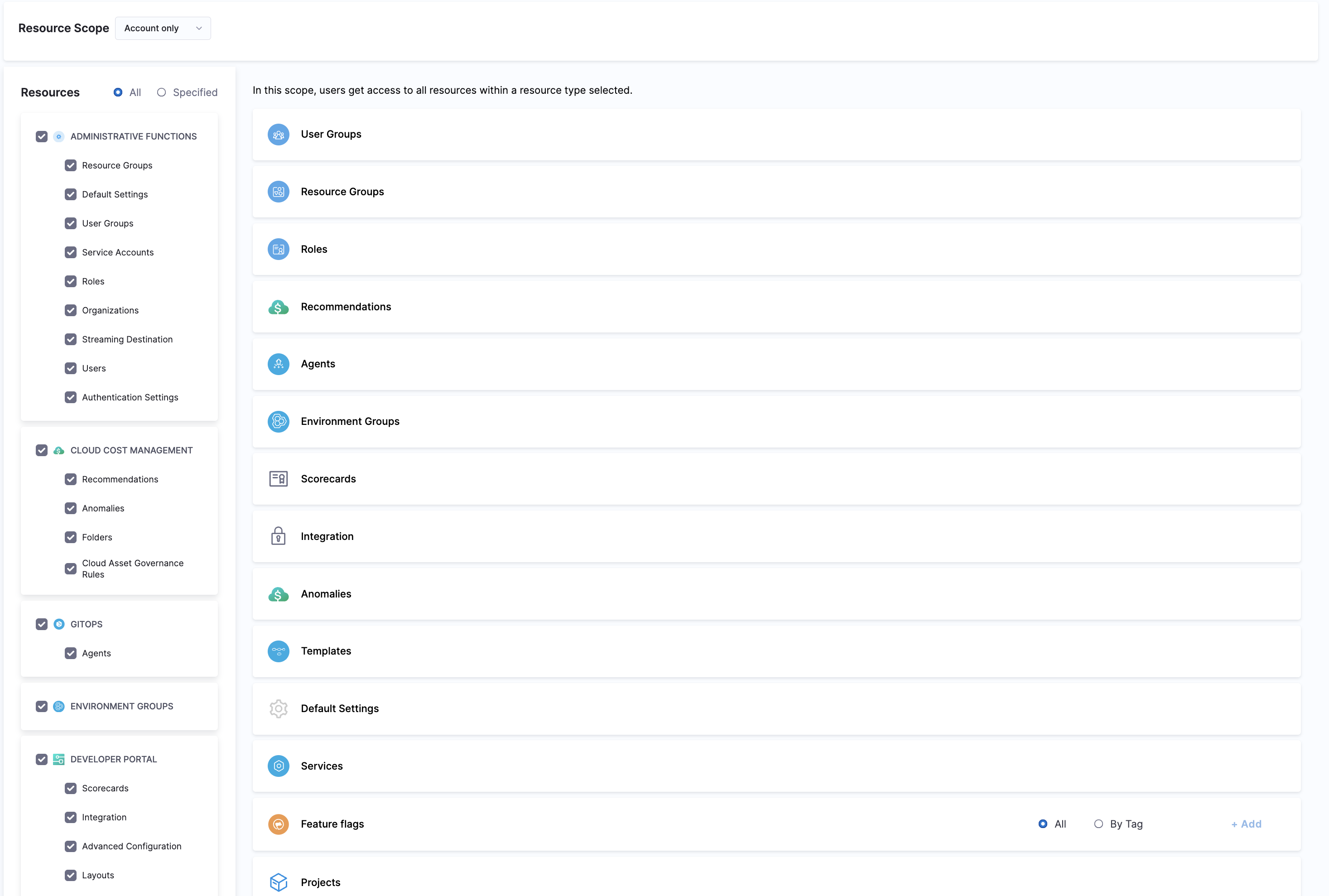 Note: If a resource group is created at the Project level, you cannot select Org or Account scopes for it. Learn more about Scopes and Refinement.