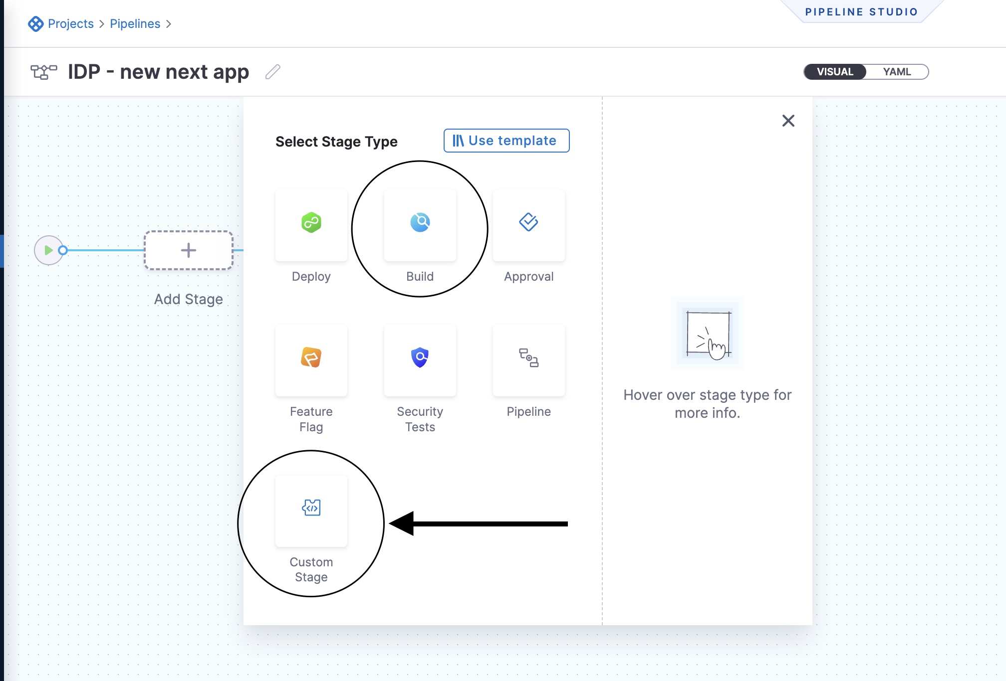 To create a Build or Custom stage, perform the following steps: