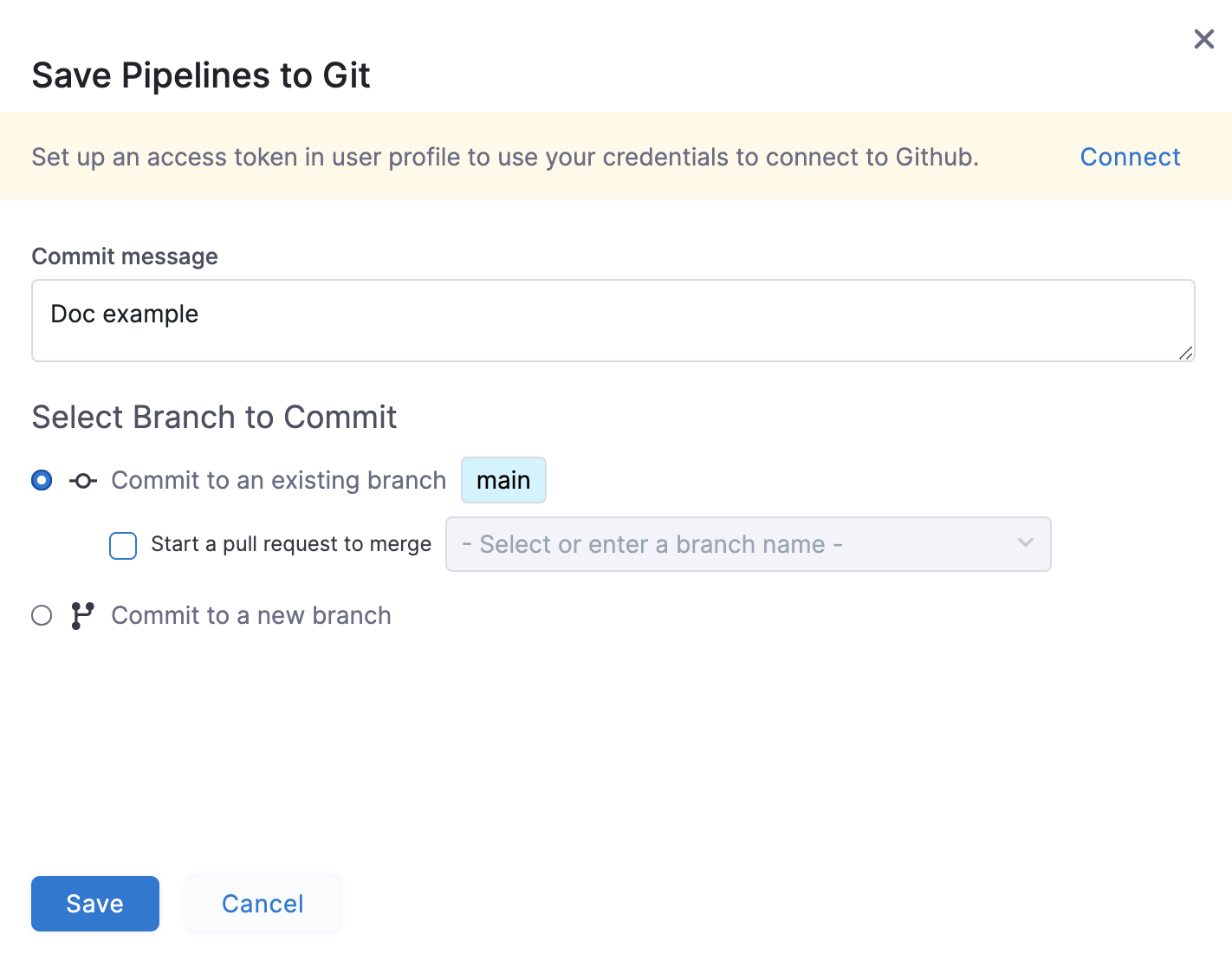 Select Connect to configure OAuth for Git and use your Git credentials for the commit, and then select Save. This is optional.