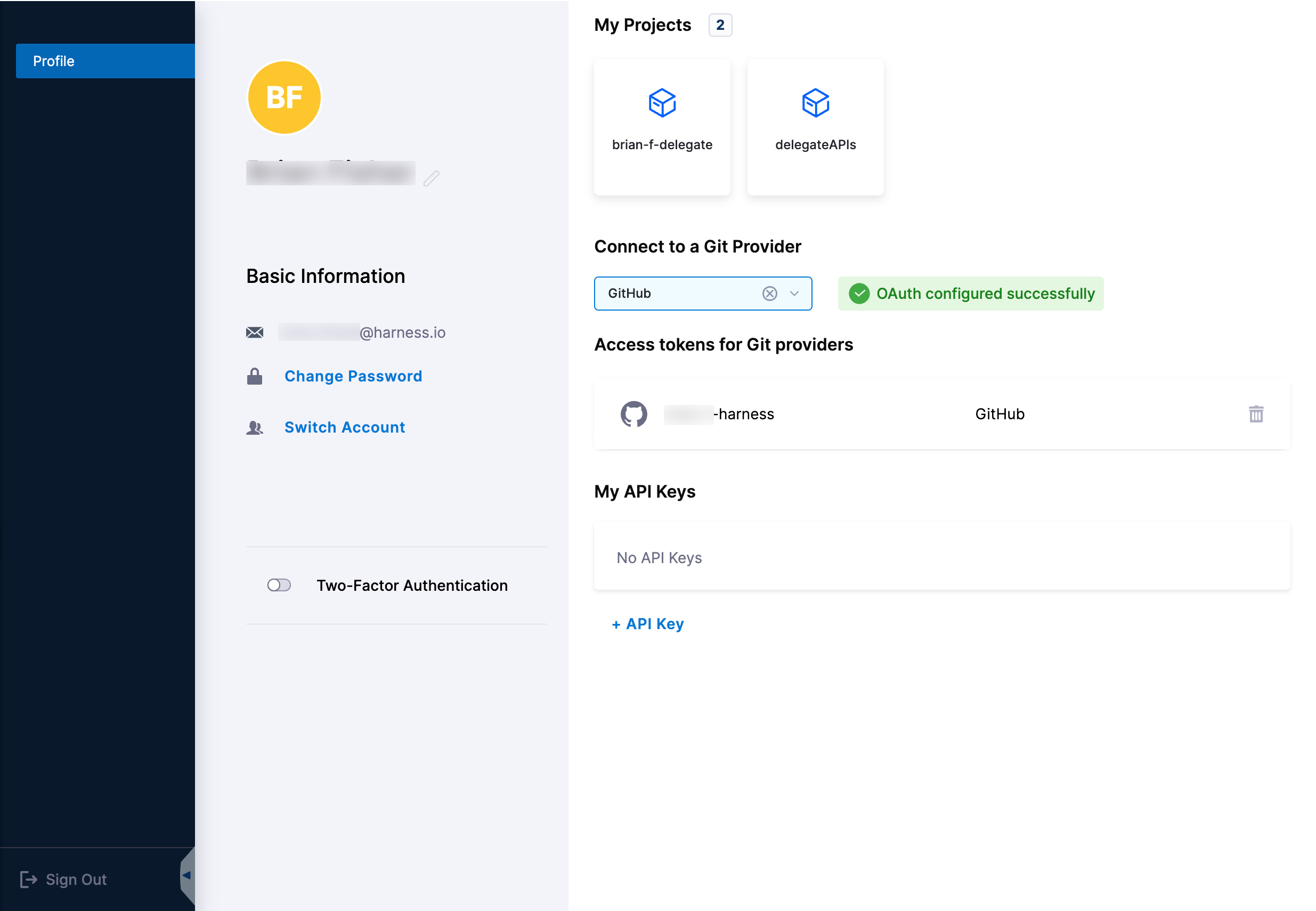 You can push configuration changes using your own credentials by integrating OAuth with Git. When you integrate OAuth with Git Experience, the credentials are stored in your Harness account user profile. These credentials are used for any subsequent commits.