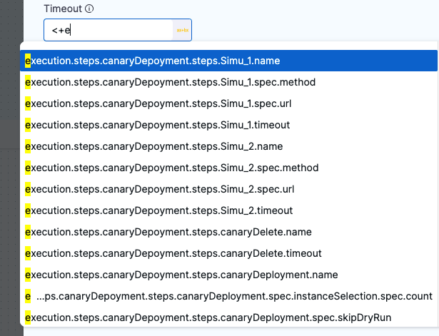When you type <+, Harness provides suggestions for built-in expressions as you type.
