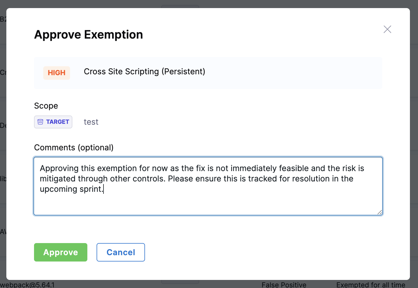 • Approve for this target – Applies the exemption only to the specific target where the issue was found.