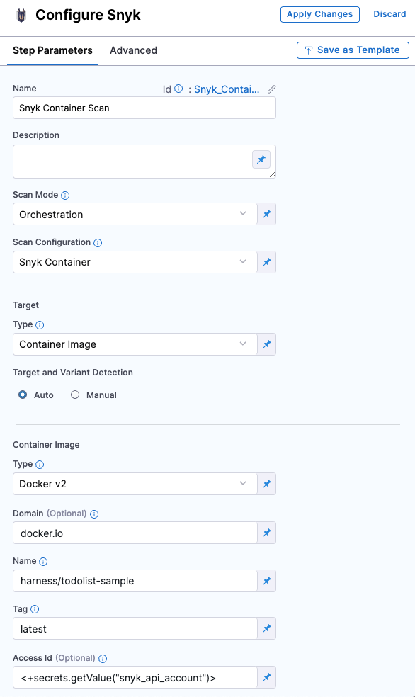 Refer to the Snyk step configuration document to learn more about the fields in the Snyk step and how to configure them.