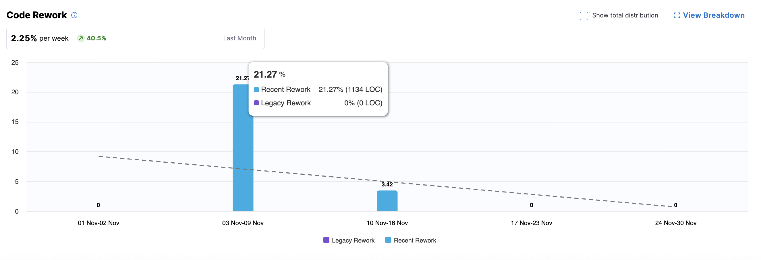 The summary metric highlight trends in code rework and the bar chart displays rework percentages over time. You can hover over a bar for a specific week to see the split of Recent Rework versus Legacy Rework.