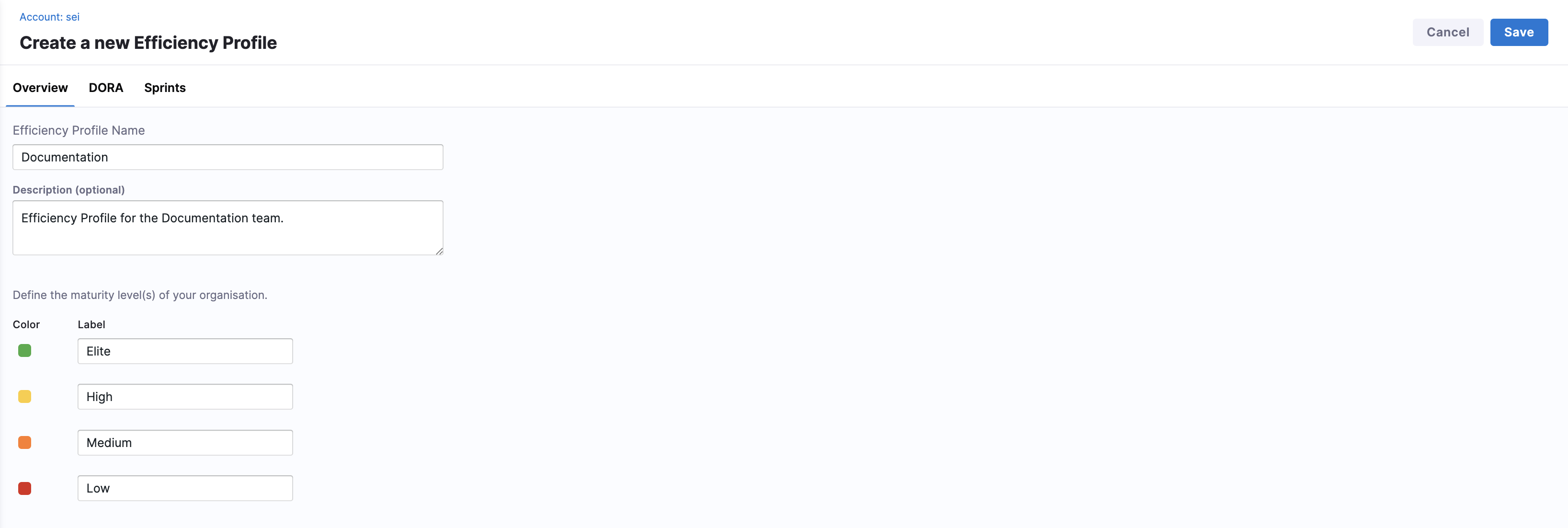 In the Overview tab, enter a name, add an optional description for the profile, and define maturity levels. Maturity levels help categorize delivery performance across your organization. These maturity levels are used across DORA and sprint reporting and dashboards.