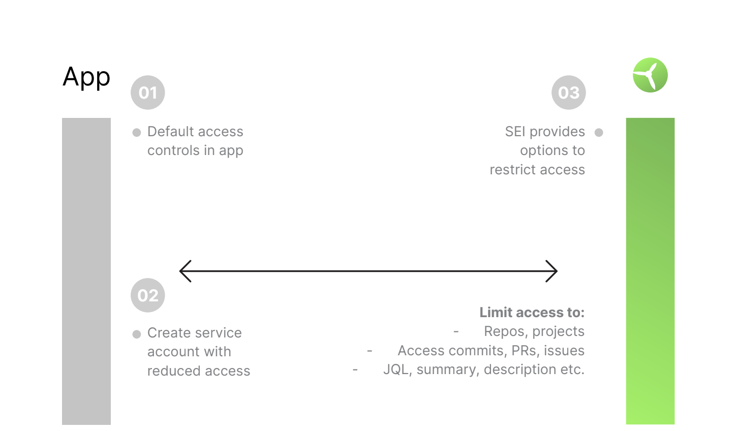 • Ingestion Satellite: The SEI Ingestion Satellite connects outbound to on-premise systems like Jira and GitHub to fetch metadata through APIs. The authentication tokens used for these connections remain within the user's environment and are never exposed externally.