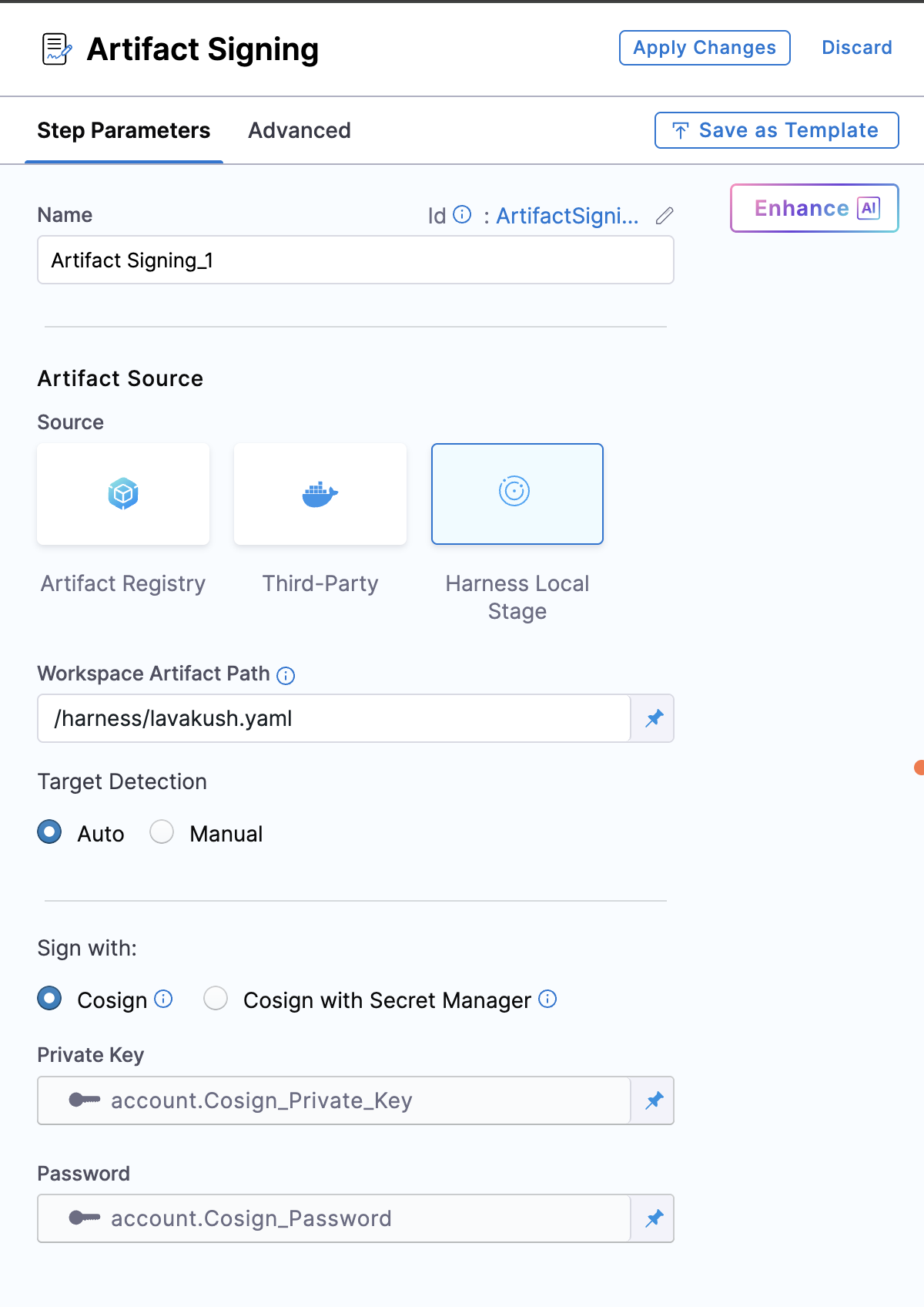 The Artifact Signing step allows you to sign your artifacts and optionally push the generated signature file .sig to the same artifact registry from which the artifact was retrieved.