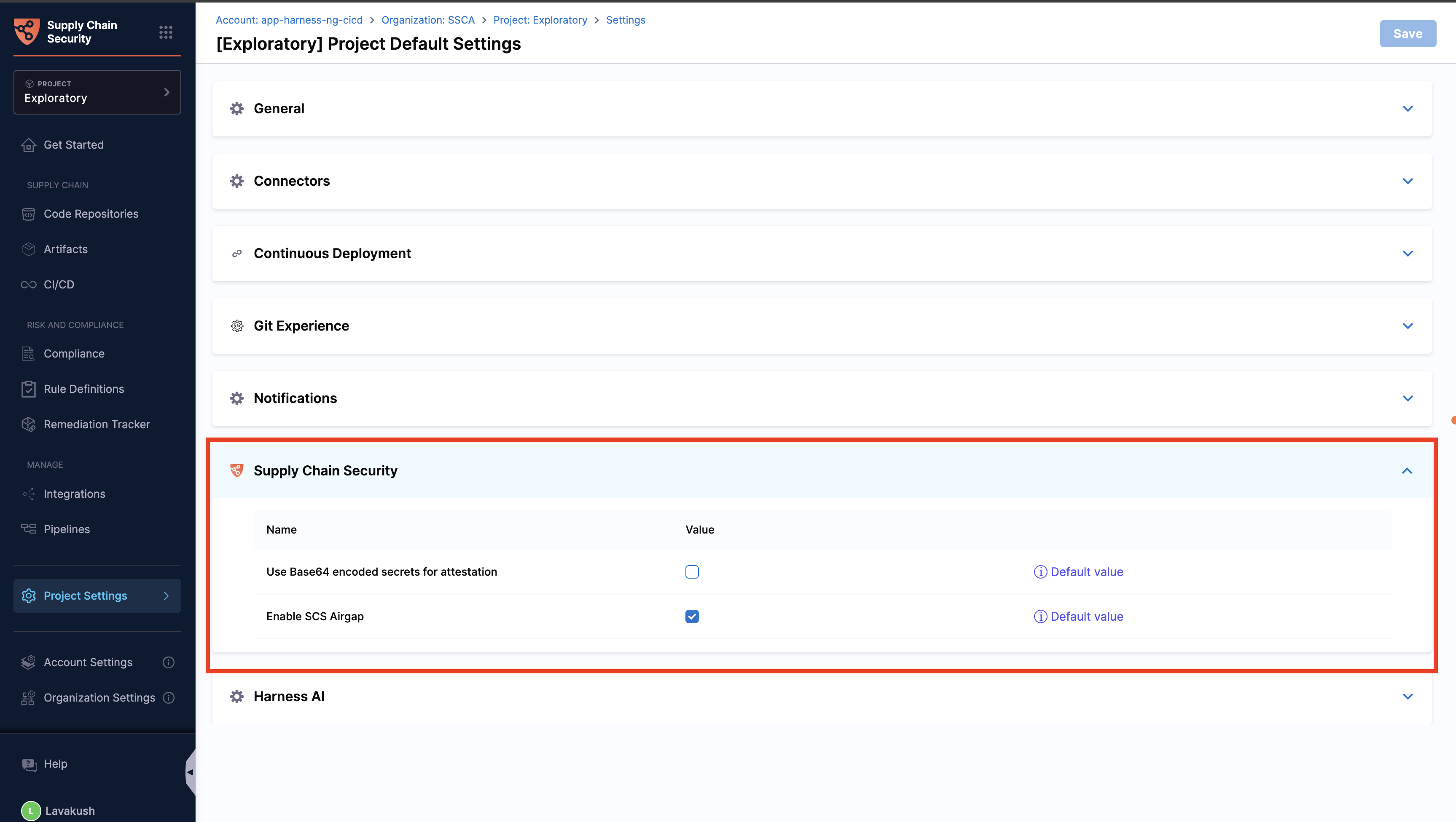 Default settings for Harness SCS can be configured at the account, organization, or project level. These settings ensure consistent behavior across all SCS steps and pipelines without requiring repetitive configuration.