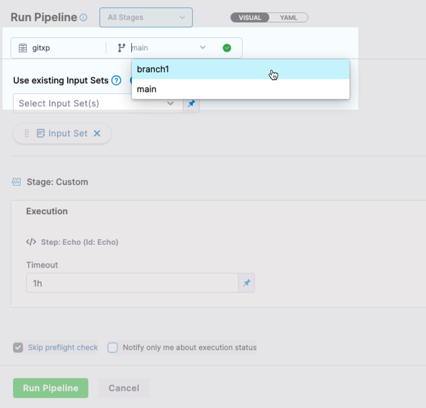 - Fixed an issue where Git Experience pipelines triggered from the input sets page without query parameters passed the pipeline branch as default instead of the actual branch. This occurred when accessing input sets via the simplified URL without branch query parameters, causing branch validation policies to fail even though the pipeline worked correctly when accessed with full query parameters including the branch. The input sets page now correctly resolves the pipeline branch instead of using default. (PIPE-30792, ZD-97661)